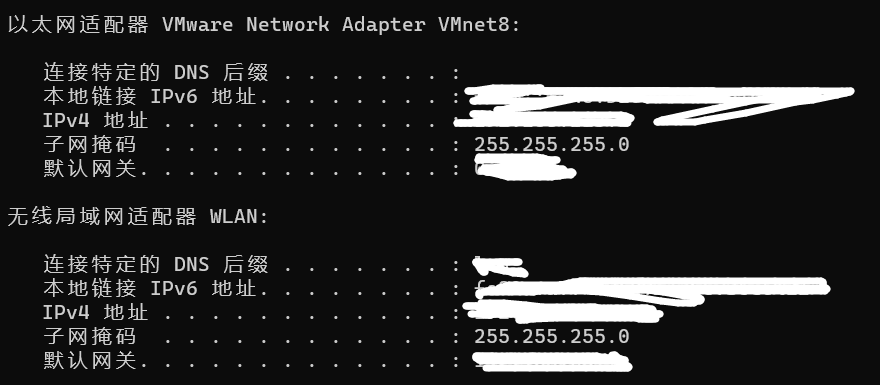 - 首先要在Windows控制台输入ipconfig查询Vmnet8和本地网络IP地址以及默认网关然后