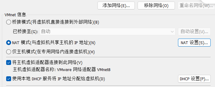 然后在添加下列这些,IPADDR要设置为和Vmnet8 IP相同网段(和上面添加转发的虚拟机ip地址应该要一致),NETMASK就设置255.255.255.0,GATEWAY设置默认网关,要和Vmnet8相同,然后DNS=8.8.8.8