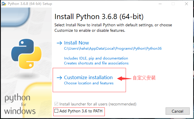 勾选Add python 3.6 to PATH(PATH的意思是操作系统环境变量)