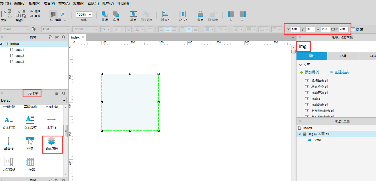第一步:在“原件库”中,选择“动态面版”原件,鼠标拖动到页面编辑区,命名为 img。(我将图片放到 x:100, y: 100 的位置),动态面板根据图片尺寸调整,本例中大小为 200*200大小。