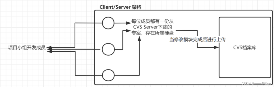 CVS(Concurrent Versions System)是代码管理工具诞生以来,最早出现的一名成员了。不过可惜的是拥有悠久历史的它,不得不在当前的时代浪潮下安静的退出舞台。CVS使用Client/Server架构,项目小组的每一位开发人员都会去记录到一个CVS Server档案库中,当小组项目开发人员编辑完自己的CVS Server后,会将其上传到一个公共的CVS Server档案库中。