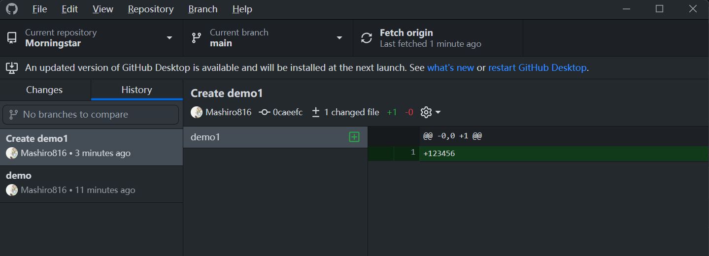 在Github Desktop中使用Pull功能,就会更新刚创建的代码,同时也会同步更新到本地仓库文件夹中:
