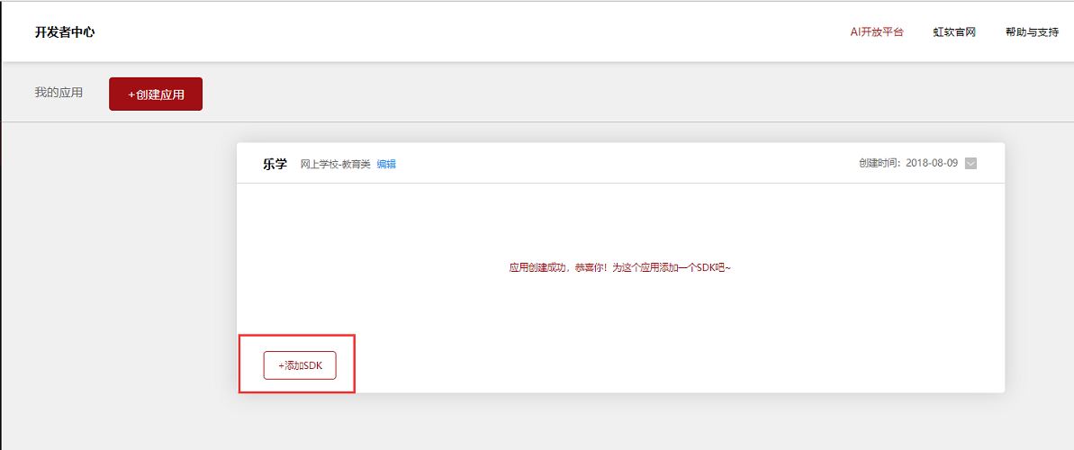在您创建完毕应用后,点击应用内的「添加SDK」,为当前应用配置合适的SDK。如下图所示: