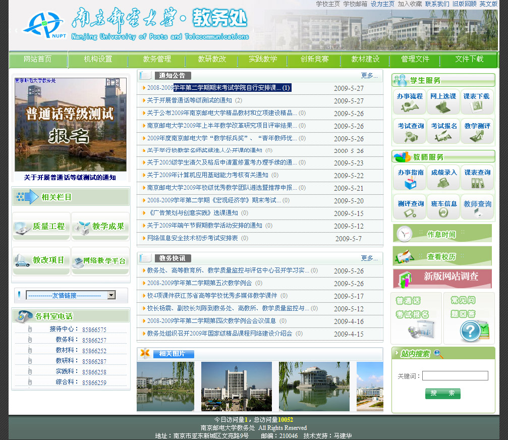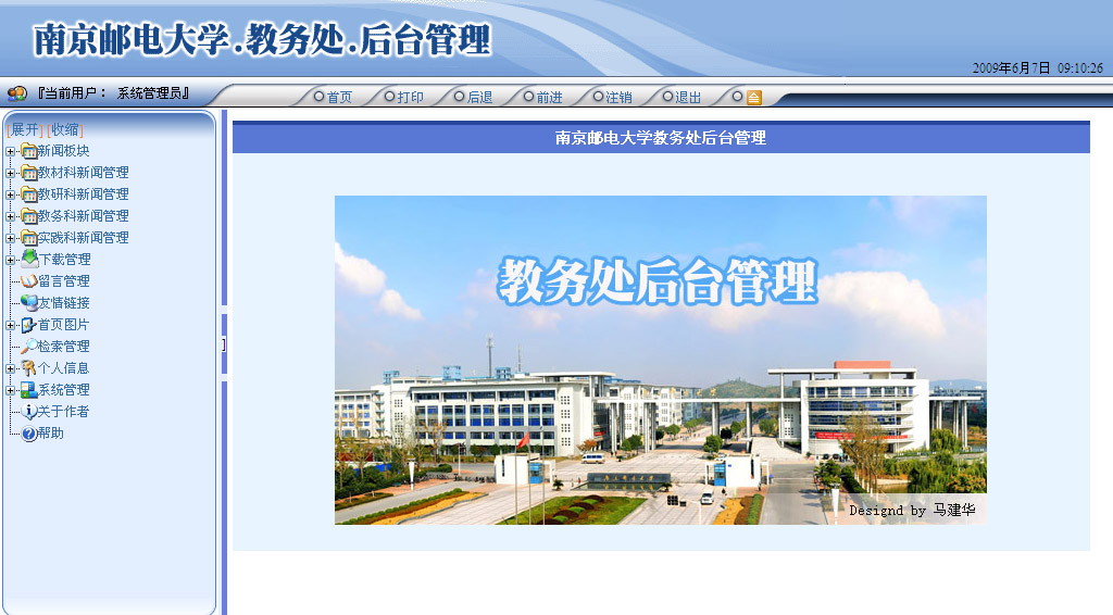 南京邮电大学教务处后台管理系统是专为南京邮电大学教务处提供后台管理的信息化软件,提供包括:新闻管理、文件下载、友情链接、检索管理、后台帐号等综合性的后台管理。后的进入方法是:点击首页下面的“南京邮电大学教务处”字样中的“教务处”便可进入。首页如下图所示: