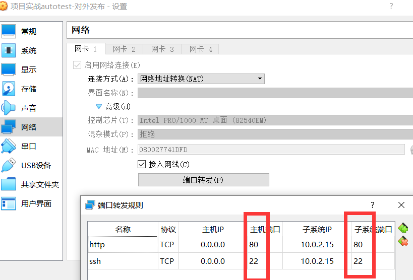 3.然后还是发现不通,后来看了教程,改了虚拟机的网络设置,改成了NAT模式,并且配了转发端口