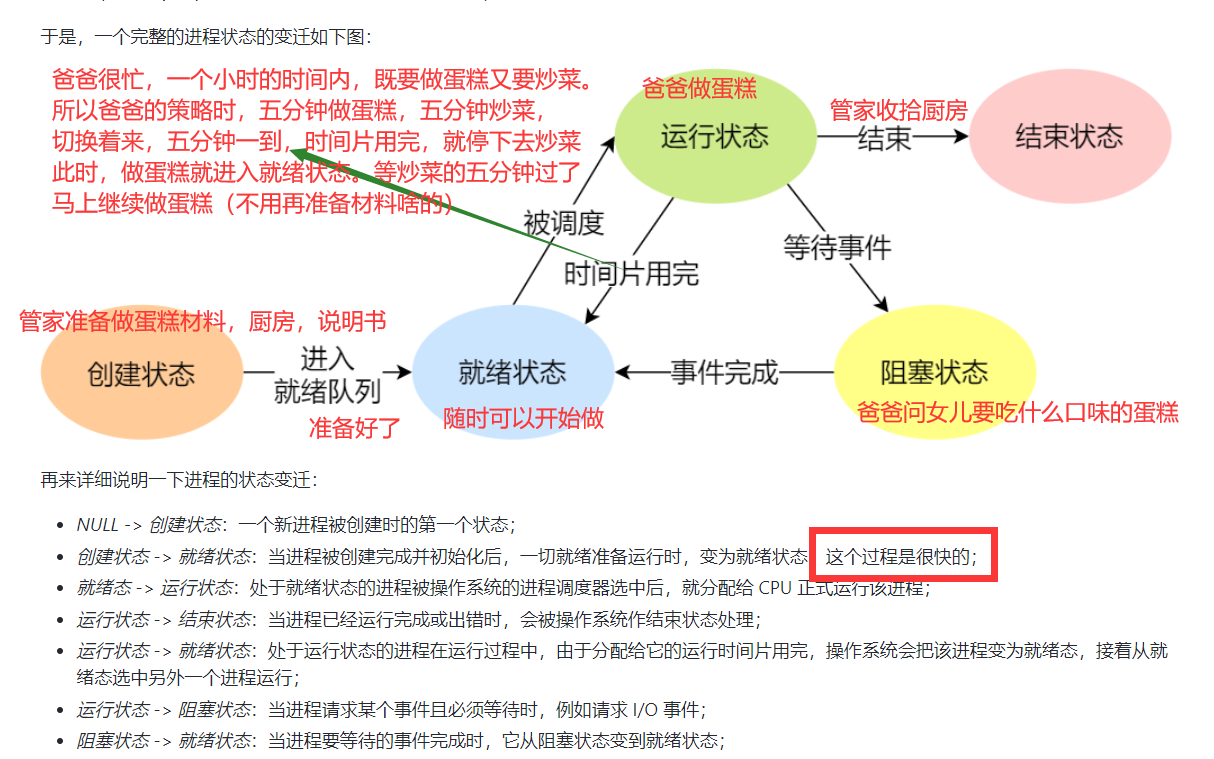 家里有一个生活管家,负责解决这件事情 后来,终于想出了一个好的方法,既然事情太多了,事情状态也多。 那么就总结一下这些事情一共有几种,分类一下,然后解决它 后来总结就发现,这些事情一共有5种状态 (1)创建状态:管家准备材料,把说明书放到厨房桌子上,准备厨具到爸爸依赖就可以马上做蛋糕的这个过程 (2)就绪状态:所有的东西都准备好啦,所以现在是准备就绪状态,随时可以运行,也就是爸爸随时可以做蛋糕 也会因为中途去做别的事情了而展示停止运行 (比如爸爸中途去给弟弟包扎伤口) (3)运行状态:正在认真做蛋糕的时候,爸爸被做蛋糕这件事情占用了 (4)阻塞状态:做蛋糕的过程中,爸爸问女儿,想吃什么口味的蛋糕 要等到女儿回复了他才能进行下一步 (5)结束状态:蛋糕做好了,管家打扫卫生,收拾厨房,这个过程就处于结束状态