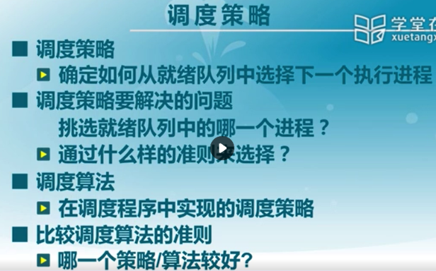 ------可抢占进程和不可抢占进程 爸爸给宝宝喂奶,这个过程中爸爸不能离开宝宝,必须等到这件事情结束 爸爸才能去做别的事情 --------爸爸给宝宝喂奶这件事情就是 不可抢占进程 爸爸给女儿做蛋糕,后来儿子受伤了,所以爸爸停下做蛋糕,然后 去给儿子包扎,不用像上面那样非要等蛋糕做完才能做另一件事情 --------爸爸给女儿做蛋糕,这件事情就是可以抢占进程 ---PPT概念对应---- 进程切换:CPU资源的当前占用着切换, 保存当前进程在PCB中的执行上下文(CPU状态) 回复下一个进程的执行上下文 ------爸爸做蛋糕和爸爸做晚饭,CPU资源是爸爸 0-30min 爸爸被做蛋糕这件事情占用, 31-60min爸爸被做晚饭这件事情占用 处理机调度: 上面过程中,爸爸为什么知道要从做蛋糕切换到做晚饭? ---答案是,管家安排的,管家看着客厅小黑板就绪那行的小纸条 觉得下一件比较重要的事情是做晚饭,这个时候妈妈出去上班了还没回来 就只有爸爸有空,所以管家认为做晚饭这件事情爸爸来做比较合适 就把做晚饭的小纸条放到就绪那行的最前面了 ---调度时机--- 管家怎么判断这件事情什么时候该暂停下然后做别的事情呢? 由于资源有限,事情又多,做每件事情的时间,管家都给了一个统一的计时器,30min 任何一个事情,做了30min就应该暂停考虑一下 所以时机有: (1)30min闹钟响的时候-----对应进程时间片用完,当前进程会从运行状态变为就绪状态 (2)爸爸问女儿要什么口味的蛋糕,等女儿回复的时候-----这个时候进程从运行状态切换到就绪状态 (3)有别的优先级更高的进程从等待变为就绪状态,必须要先处理这个进程的时候,管家也会考虑调度