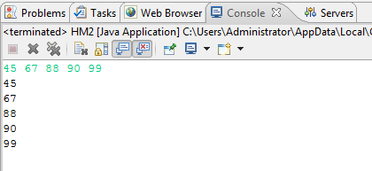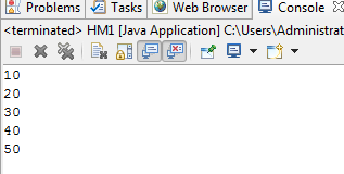 package homework; public class HM1 { /** * @param args */ public static void main(String[] args) { // TODO Auto-generated method stub int x[] = new int[] { 10, 20, 30, 40, 50 }; for (int i = 0; i < x.length; i++) { System.out.println(x[i]); } } }
