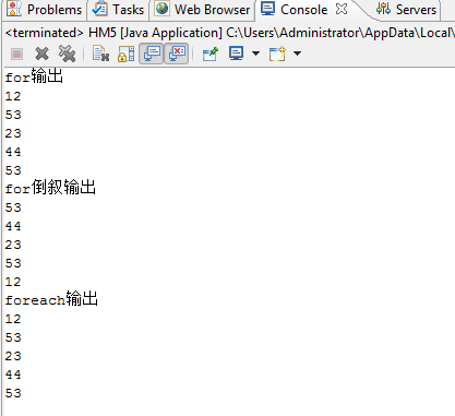 package homework; public class HM5 { /** * @param args */ public static void main(String[] args) { // TODO Auto-generated method stub int x[] = new int[] { 12, 53, 23, 44, 53 }; System.out.println("for输出"); for (int i = 0; i < x.length; i++) { System.out.println(x[i]); } System.out.println("for倒叙输出"); for (int i = 4; i >= 0; i--) { System.out.println(x[i]); } System.out.println("foreach输出"); for (int i : x) { System.out.println(i); } } }