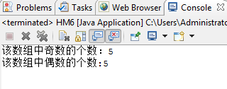package homework; public class HM6 { /** * @param args */ public static void main(String[] args) { // TODO Auto-generated method stub int x[] = { 11, 12, 13, 14, 15, 16, 17, 18, 19, 20 }; int a = 0, b = 0; for (int i = 0; i < x.length; i++) { if (x[i] % 2 == 1) { a++; } if (x[i] % 2 == 0) { b++; } } System.out.println("该数组中奇数的个数:" + a); System.out.println("该数组中偶数的个数:" + b); } }