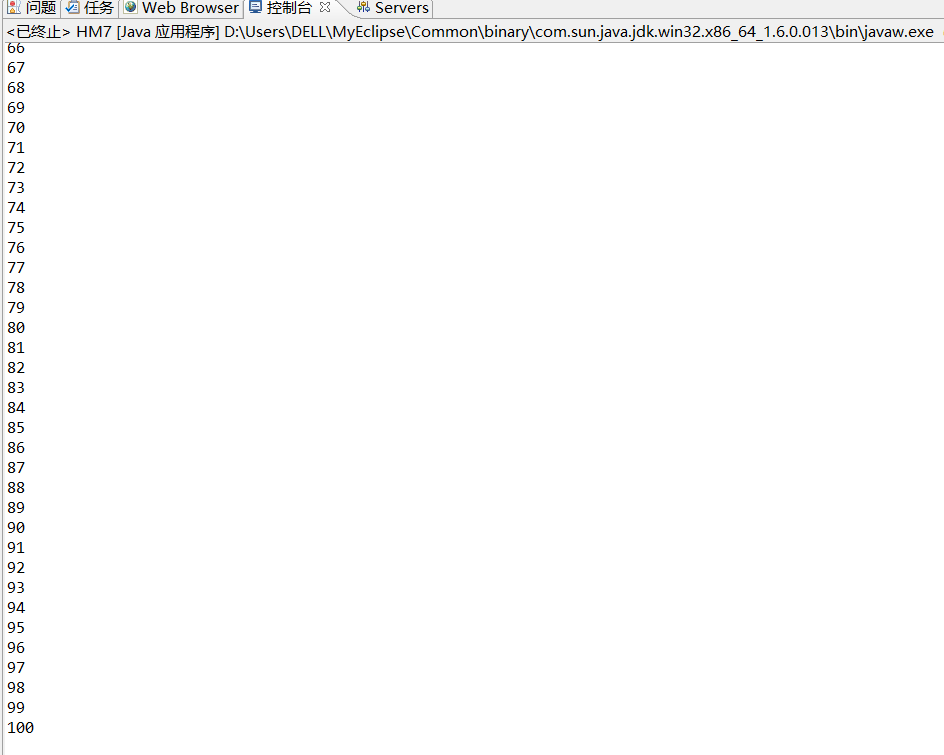 package homework; public class HM7 { /** * @param args */ public static void main(String[] args) { // TODO Auto-generated method stub int x[] = new int[100]; for (int i = 0; i < 100; i++) { x[i] = i + 1; System.out.println(x[i]); } } }