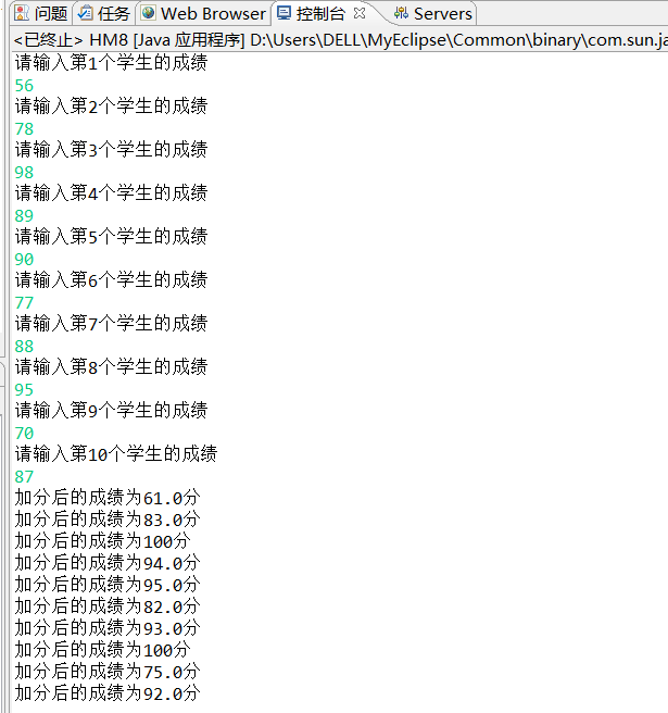 package homework; import java.util.Scanner; public class HM8 { /** * @param args */ public static void main(String[] args) { // TODO Auto-generated method stub double x[] = new double[10]; double sum = 0; Scanner input = new Scanner(System.in); for (int i = 0; i < x.length; i++) { System.out.println("请输入第" + (i + 1) + "个学生的成绩"); x[i] = input.nextInt(); } for (int i = 0; i < x.length; i++) { sum = x[i] + 5; if (sum >= 100) { System.out.println("加分后的成绩为100分"); } else { System.out.println("加分后的成绩为" + sum + "分"); } } } }