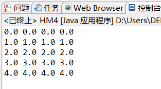 package homework; public class HM4 { /** * @param args */ public static void main(String[] args) { // TODO Auto-generated method stub double b[][] = new double[5][4]; for (int i = 0; i < b.length; i++) { for (int j = 0; j < b[i].length; j++) { b[i][j] = i; } } for (int i = 0; i < b.length; i++) { for (int j = 0; j < b[i].length; j++) { System.out.print(b[i][j] + " "); } System.out.println(); } } }