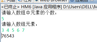 package homework; import java.util.Scanner; public class HM6 { /** * @param args */ public static void main(String[] args) { // TODO Auto-generated method stub Scanner input = new Scanner(System.in); System.out.println("请输入数组中元素的个数:"); int x = input.nextInt(); int y[] = new int[x]; System.out.println("请输入数组元素:"); for (int i = 0; i < x; i++) { y[i] = input.nextInt(); } for (int j = x - 1; j > 0; j--) { System.out.print(y[j]); } System.out.println(y[0]); } }