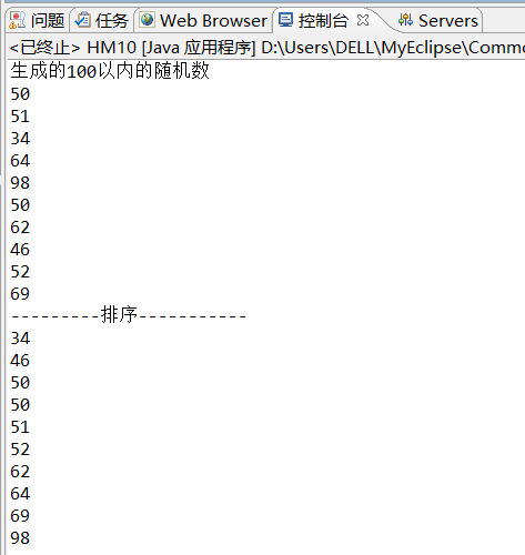 10、生成一个长度为10的随机整数数组(每个数都是0-100之间),输出,排序后,再输出