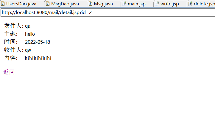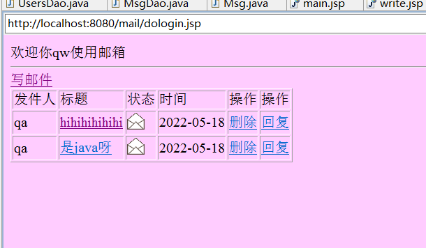 2.实现阅读邮件功能:在main.jsp中点击任意邮件的标题,进入到detail.jsp显示邮件详情,包括发件人,主题,内容,时间。同时需要把邮件状态修改为已读。