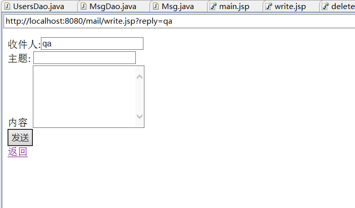 <%@ page language="java" import="java.util.*" pageEncoding="utf-8"%> <!DOCTYPE HTML PUBLIC "-//W3C//DTD HTML 4.01 Transitional//EN"> <html> <head> <title>My JSP 'write.jsp' starting page</title> </head> <body> <form action="dowrite.jsp" method="post"> 收件人:<input type="text" name="receiver" value="<%=request.getParameter("reply")%>"><br> 主题: <input type="text" name="title"><br> 内容 <textarea rows="6" cols="20" name="content"></textarea> <br> <input type="submit" value="发送"> <br> <a href="main.jsp">返回</a> </form> </body> </html>