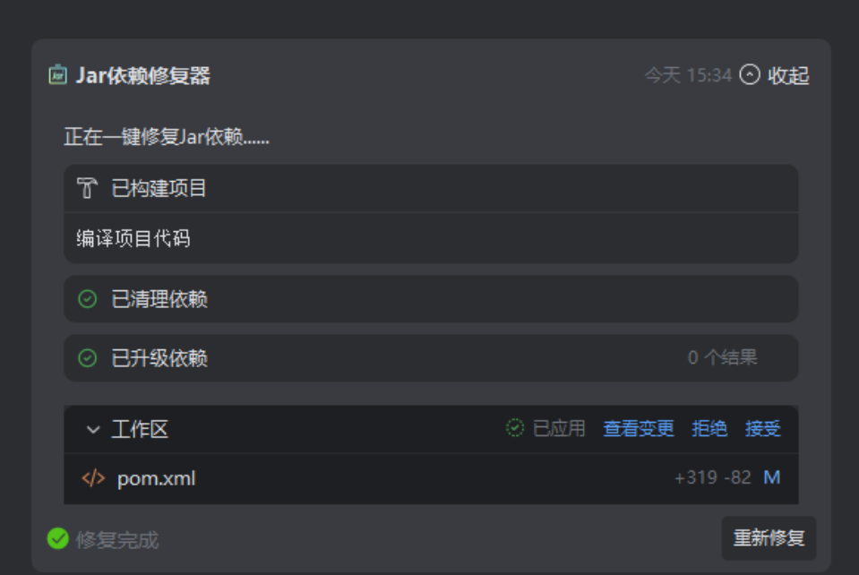 对于已经变得臃肿的项目,飞算JavaAI的“Jar依赖修复器”就像一位“清道夫”。传统方法排查依赖冲突需要借助Maven Helper逐个检查依赖树,对比版本并寻找传递依赖,耗时且容易遗漏。而飞算JavaAI能一键扫描整个项目的pom.xml,快速标记出三类主要问题: