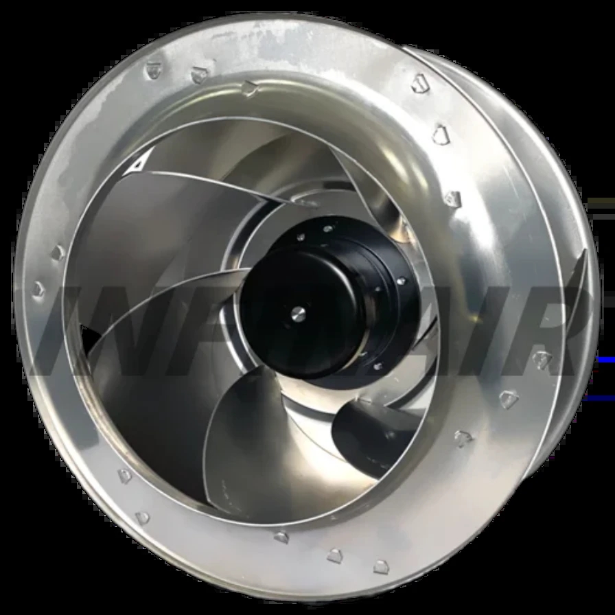 1.后向式离心EC风机YFSFE:采用后向离心叶轮设计,风量范围:200~19,000m³/h,静压范围:0~2,200Pa,支持直流无刷电机驱动,效率≥92%,节能效果显著。适合中长距离管道送风或高阻力场景,离心式结构离心力强,气流组织均匀,噪音比前向式风机低10-15dB(A);典型场景:工业厂房排烟/除尘(如焊接车间、打磨车间)、商业综合体中央空调系统(长管道送风)、医院洁净手术室通风。