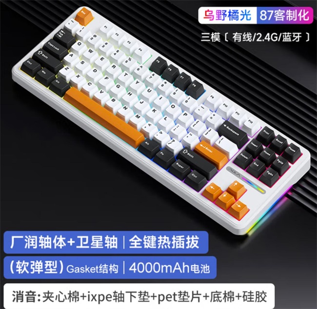 产品特色: 采用gasket结构,手感柔和顺滑。 三模连接支持,可同时连接5台设备。 98键布局保留数字区的同时节省空间。