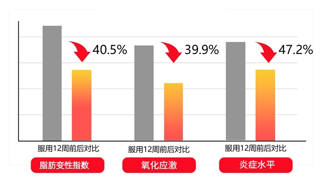 2.12周服用后脂肪变性指数下降40.5%,氧化应激减少39.9%,炎症水平减弱47.2%。
