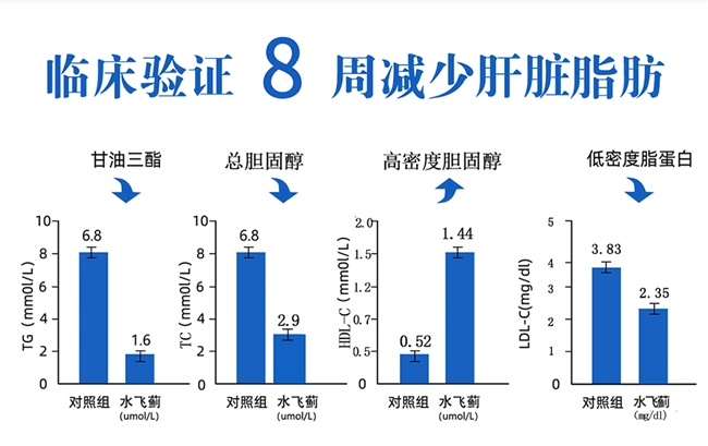 1.脂肪肝患者8周甘油三酯下降16.2%,总胆固醇降至2.9,肝炎人群转氨酶改善达15.7%。
