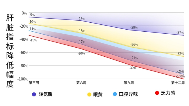 3用户反馈12周后乏力感下降-100%,转氨酶下降-37%,眼黄-32%、口腔异味-26%。多项核心生化与主观体感指标显著优于同档竞品。肝膜修复速率快,维持稳定性佳。