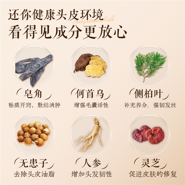 产品的配方逻辑深谙中医“君臣佐使”的协同之道。以何首乌为“君”,《本草纲目》载其能“养血益肝,固精益肾,乌髭发”,现代研究亦证实其提取物有助于滋养毛囊、延长生长期。侧柏叶(清热凉血)、当归(活血通络)共为“臣”,辅助改善头皮微循环与营养供给。无患子与皂角作为天然清洁“佐”剂,温和净澈不伤屏障;再以人参、灵芝等多味草本精华为“使”,全面调养头皮环境。整方如同一位精细的园丁,不仅为“土壤”(头皮)补充养分、疏通“水道”(毛囊),更营造出一个不利于“杂草”(脱发因素)生长的健康生态,从而实现防脱固发的根本目标。