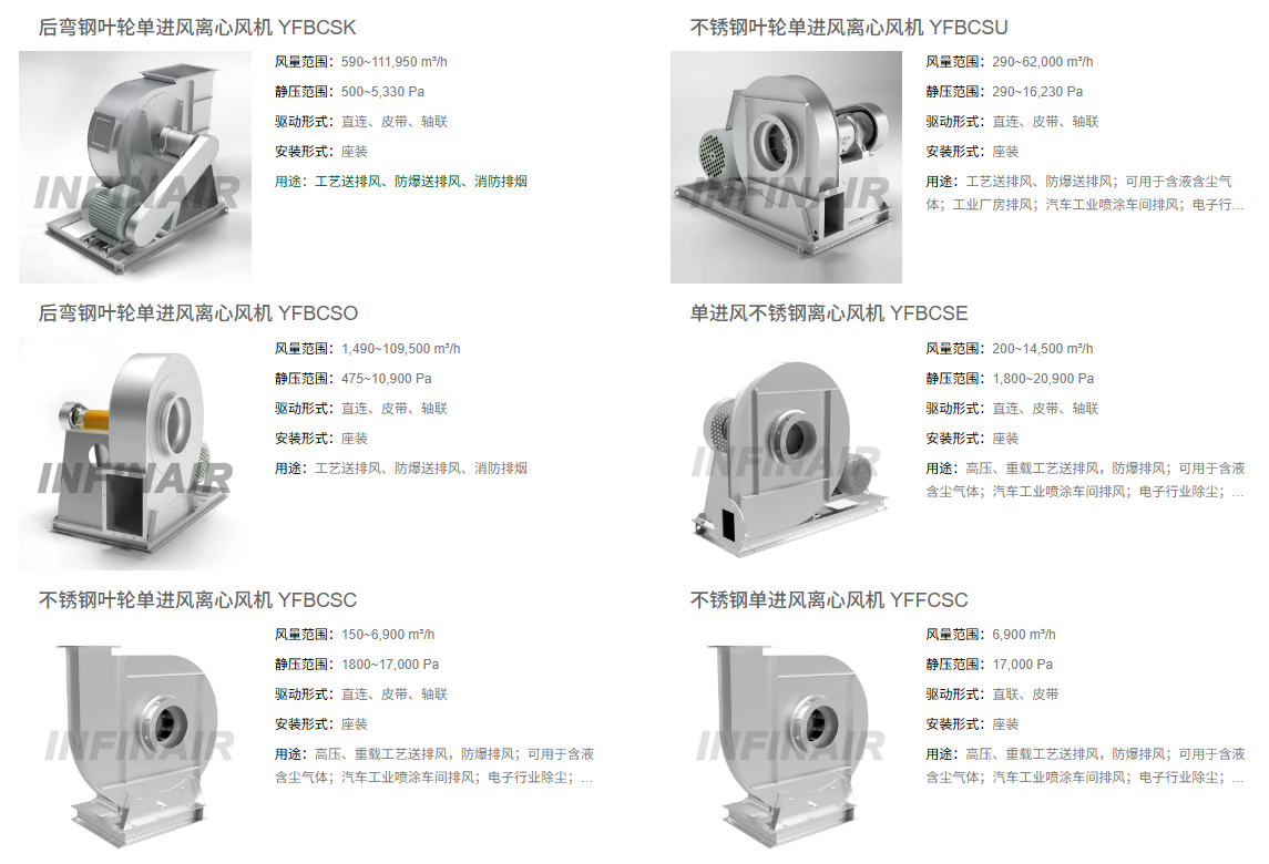1.耐高温离心风机系列——YFBCSU/YFBCSO/YFBCSE/YFBCSC/YFFCSC,产品亮点:①全系列采用高温材料与高耐热设计②气动性能细分匹配不同压力与风量区间③可根据现场工况定制性能曲线与结构形式④热力学稳定,适合多种高热负载场景。