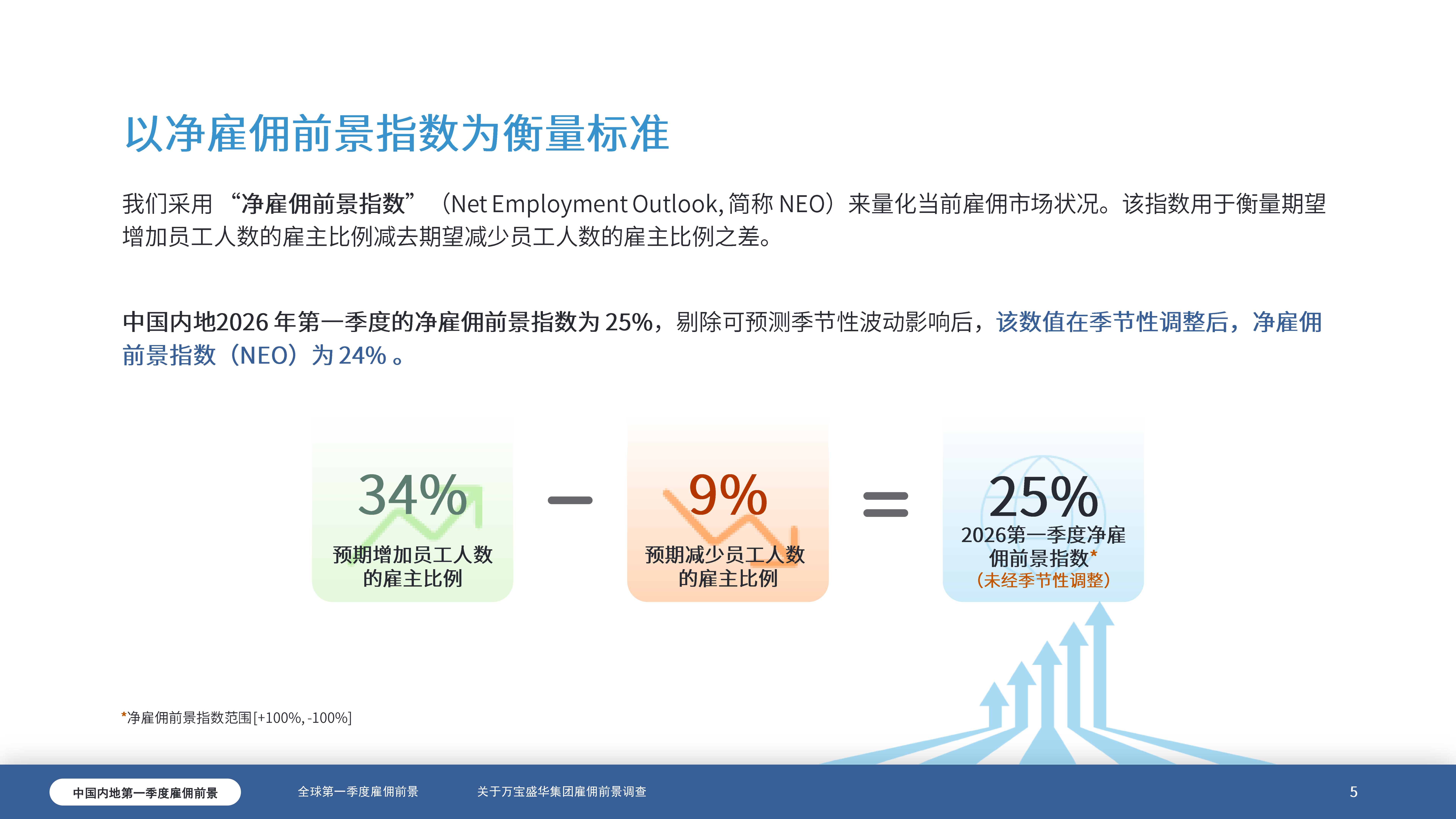 万宝盛华集团《2026 年第一季度雇佣前景调查》数据显示,全球经季节性调整后的净雇佣前景指数(NEO)为 24%,不同区域的人才市场活力呈现显著差异:亚太地区以 30% 的 NEO 指数领跑全球,印度(52%)、巴西(54%)等新兴市场展现出强劲的人才需求;北美地区美国 NEO 指数达 27%,欧洲和中东地区平均为 20%,成熟市场的人才需求更聚焦于高端复合型岗位;中国内地 NEO 指数 24%,与全球平均水平持平,为出海企业的 “国内核心团队 + 海外本地团队” 协同模式提供了人才基础。