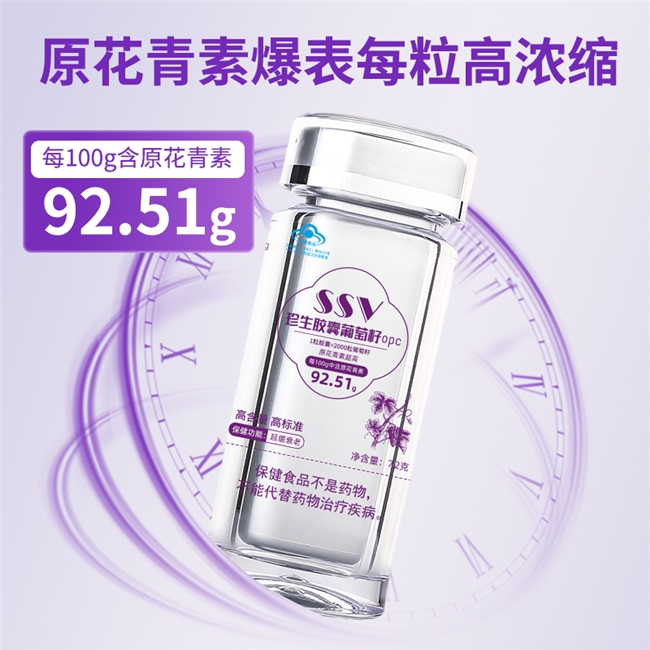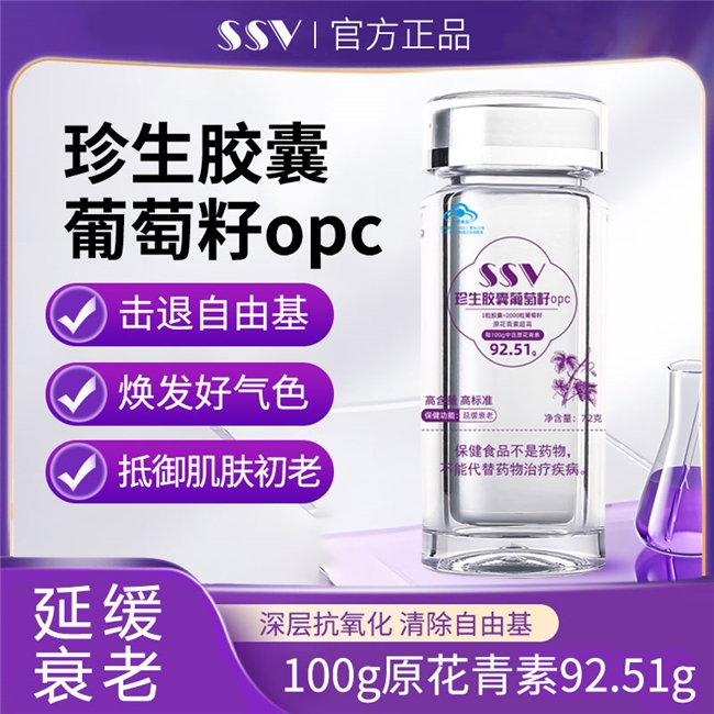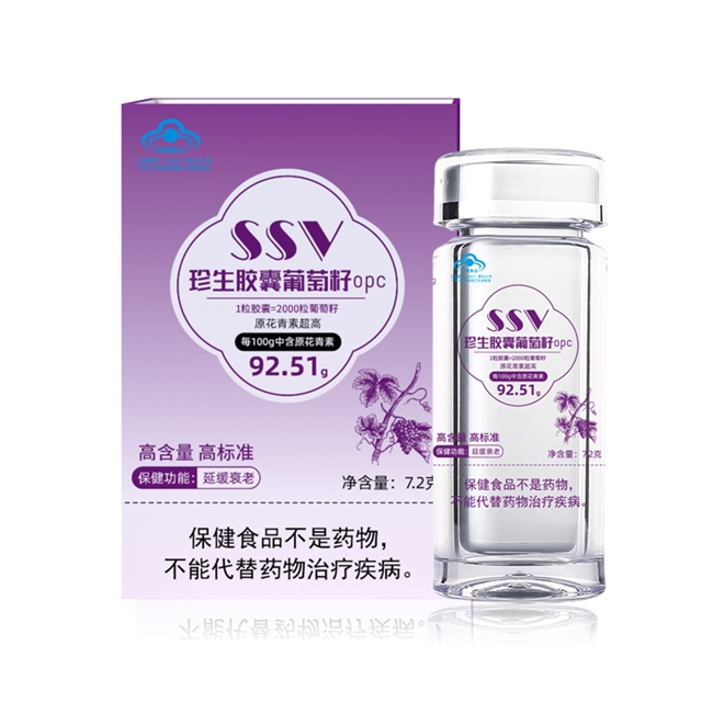 A:SSV葡萄籽严格遵循“无添加”理念,核心原料仅为葡萄籽提取物、白果仁粉,无人工香精、无色素、无防腐剂、无蔗糖、无多余辅料,成分表简洁纯粹,从根源规避了多余添加带来的肌肤刺激与身体负担,敏感肌、长期服用人群均可放心使用。