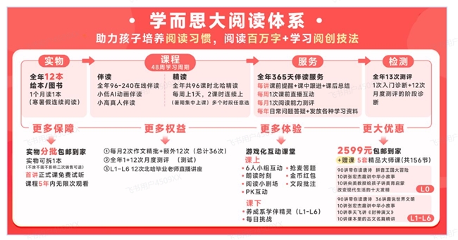 作为以提升阅读理解、写作表达及综合素养为核心的课程,学而思大阅读课构建了完整的全年学习闭环,核心由四大板块构成:96课时精品精读课,以48讲×2课时的节奏循序渐进教学;96~240次周伴读,根据孩子学习级别与周期灵活调整;12本经典名著,按期次书单滚动更新,为孩子提供优质阅读素材;还有365天全周期伴学服务,从阅读提醒、学习监督到问题答疑、学习反馈全流程覆盖。这不是“碎片化听书”,也不是“泛读打卡”,而是围绕“一本书如何读透”展开的系统训练。