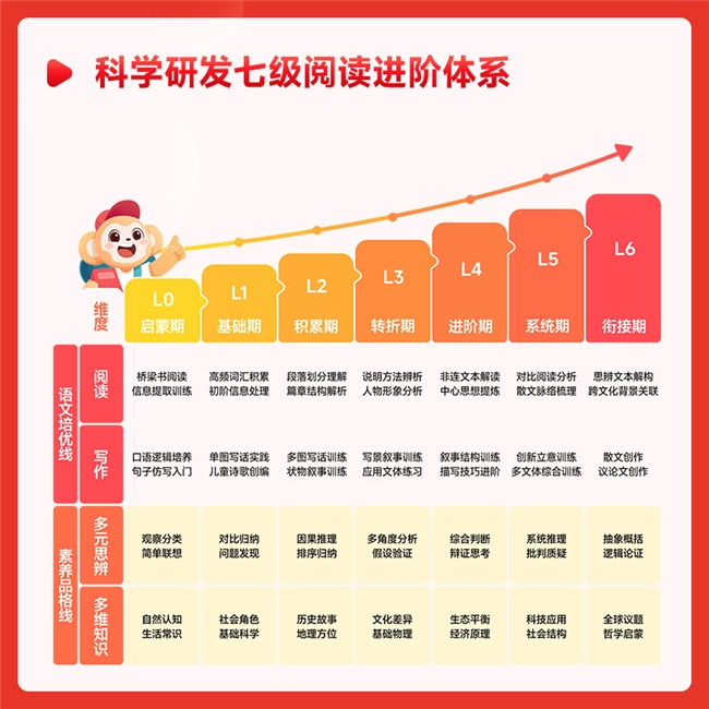 学而思大阅读依据新课标阅读能⼒标准打造出7级(L0-L6)阅读能⼒进阶体系,每个阶段匹配不同的认知发展水平,驱动认知维度从具象到抽象的逐级深化,兼顾阅读兴趣和底层阅读能力培养,既满足素质能力长线培养,又同步新课标考点,聚焦语文培优线与素养品格线双线能力提升。
