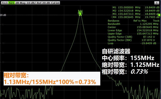 某项目所用滤波器155MHz频点实物测试图,选择性:≤1%(1dB),±10%有效抑制度≥40dB。