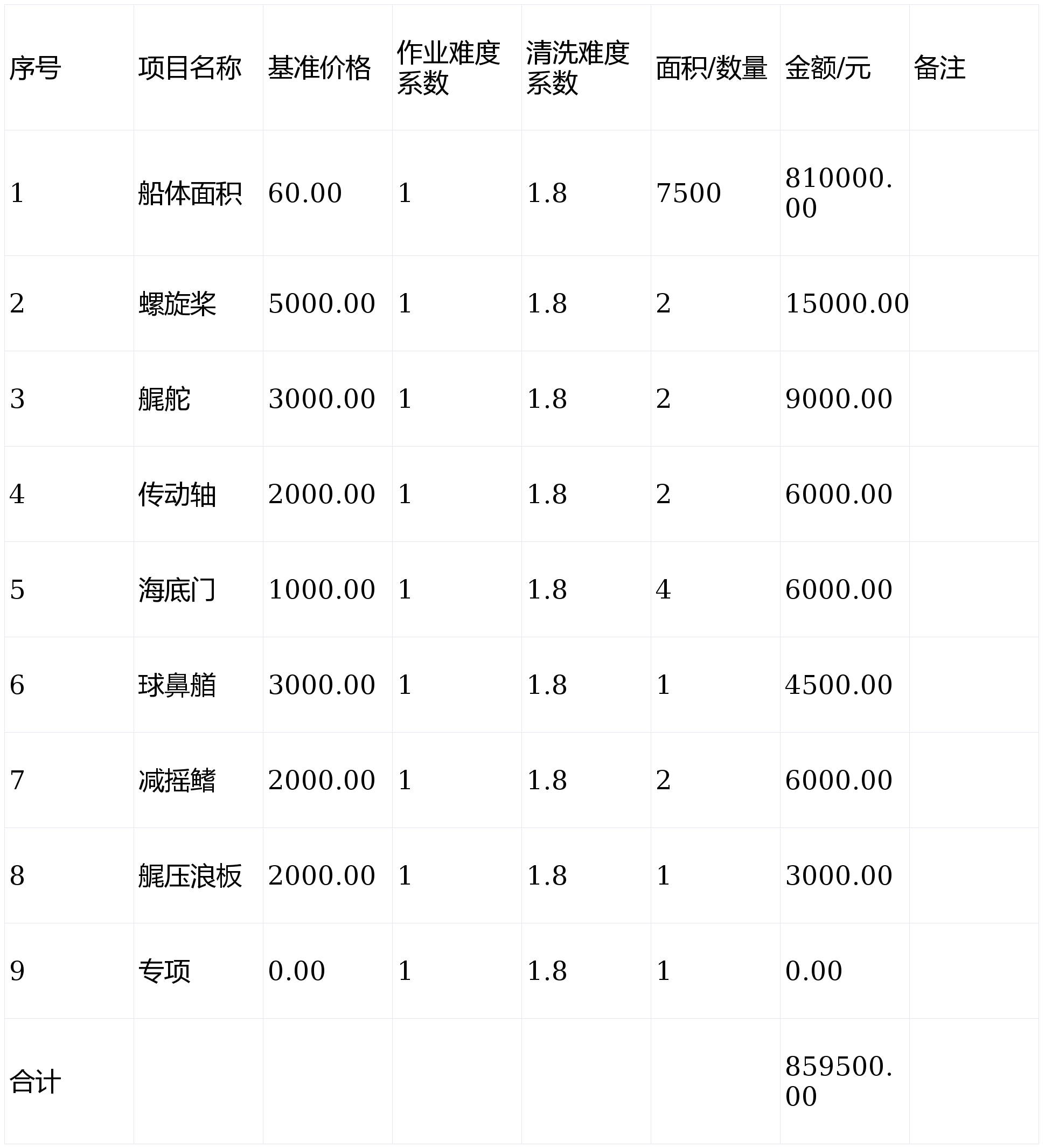 现场勘察作业难度系数为1,清洗难度等级为80,清洗难度系数则为1.8。清洗完毕后,确认工程量为:船体面积为18000㎡,螺旋桨、艉舵、传动轴、海底门、球鼻艏、减摇鳍、艉压浪板进行了清洗,无专项费用,则计价方式为: