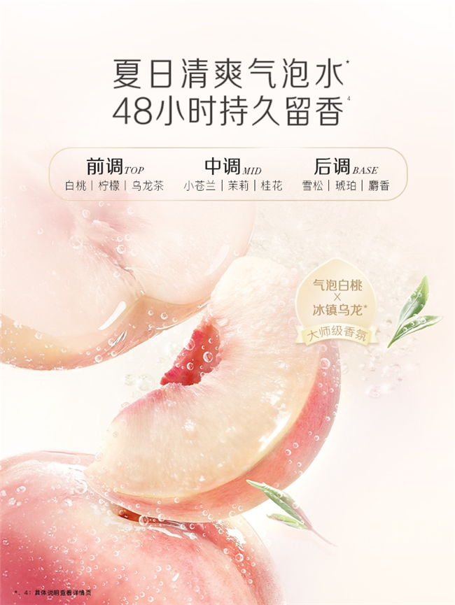 由国际著名获奖调香师匠心调配,香气高级且富有层次。它严选数十种夏日香氛,最终打造出独特的“白桃乌龙香”,如一杯夏日特调汽水:前调是气泡白桃的清甜,中调邂逅清冽的乌龙,尾调则由雪松木质琥珀带来温暖的氛围感。香味清透不腻,能实现48小时持久留香,让秀发仿佛自带氛围感体香。