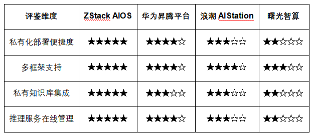浪潮 AIStation 支持大模型部署,但工具链成熟度弱于华为和ZStack,私有知识库集成需要较多自定义开发。