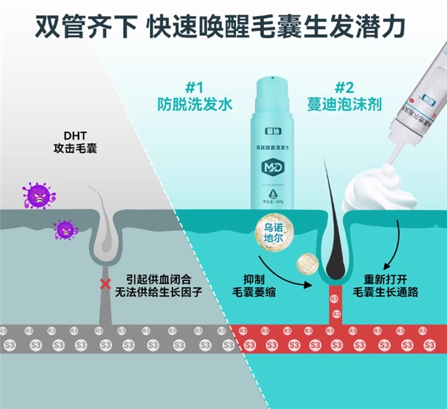 - 例如:蔓迪固发真空瓶(蔓迪防脱固发洗发水)(减少现有头发脱落)+ 米诺地尔泡沫剂外用(促进新生)