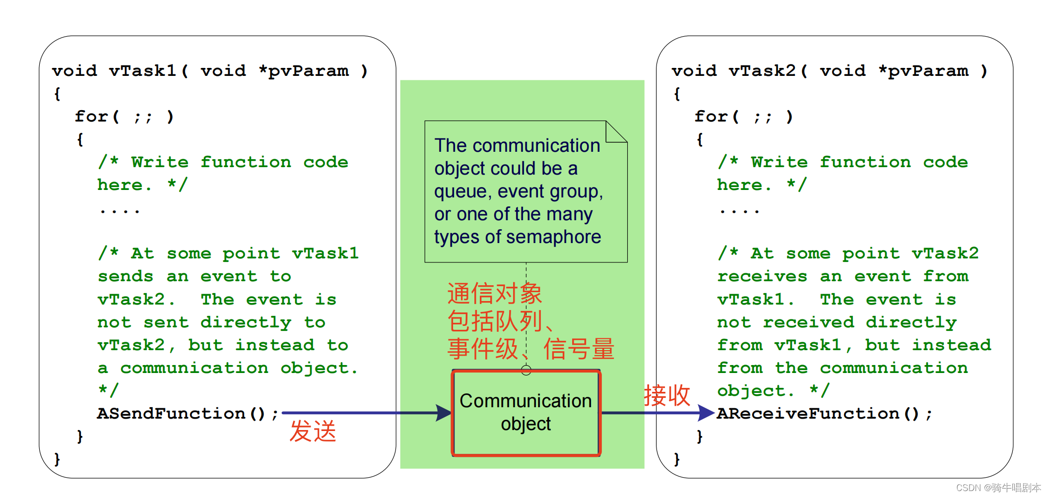 当使用通信对象时,事件和数据不会直接发送到接收任务或接收的ISR,而是发送到具体的通信对象。同样,任务和ISR从通信对象接收事件和数据,而不是直接从发送事件或数据的任务或ISR接收。如下图所示。