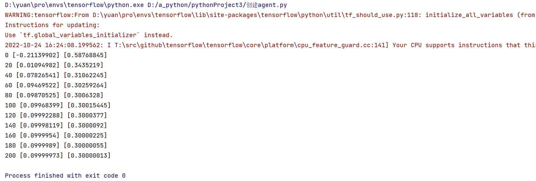 这个代码通过构建一个简单的神经网络,对随机生成的一些数据进行训练,使得它们可以收敛于x_data=0.1,y_data=3
