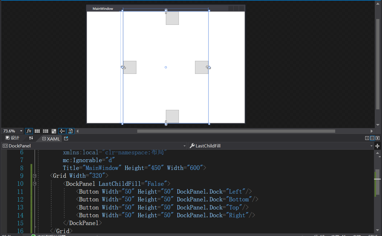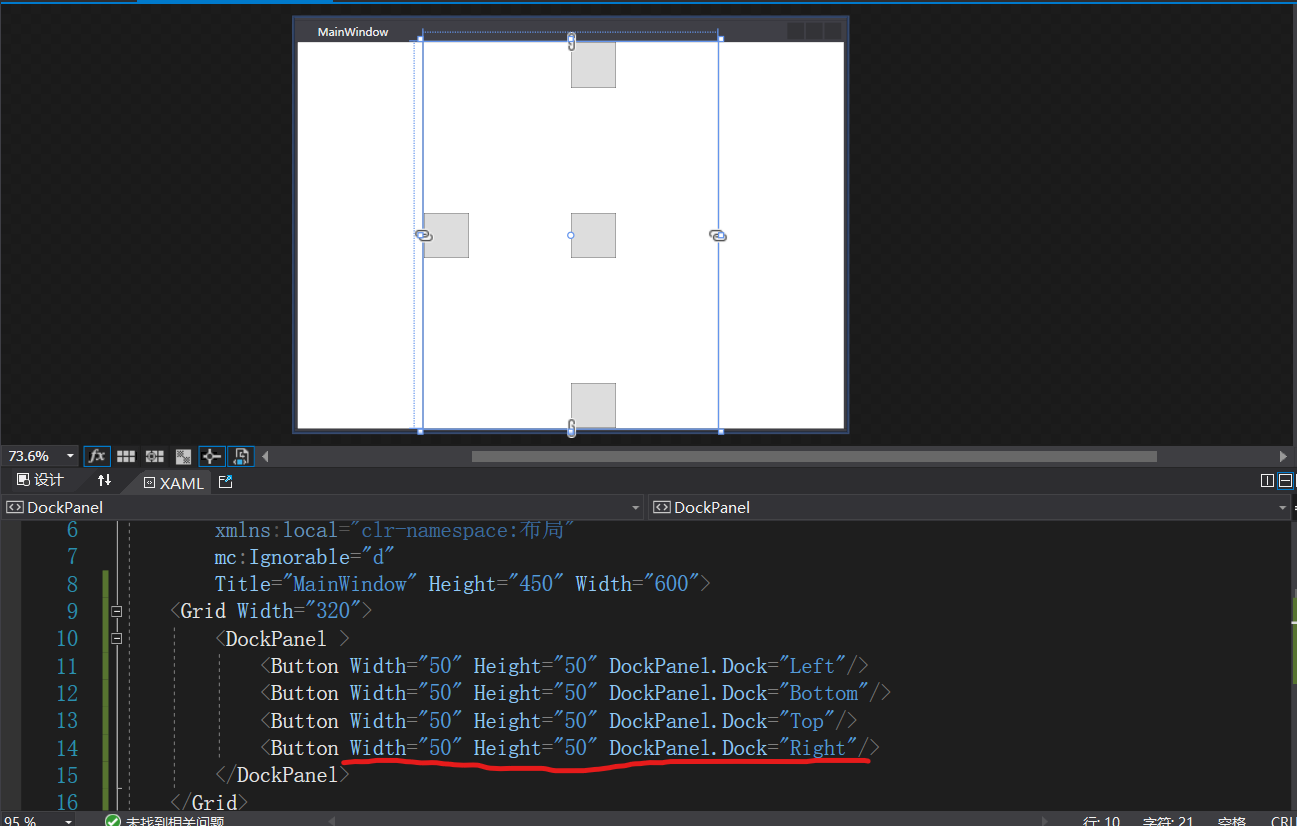 第四个button指定位置是Right但为什么在中间呢?原来DockPanel默认最后一个控件会填充满可以指定LastChildFill="false" 这样就会正常显示