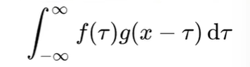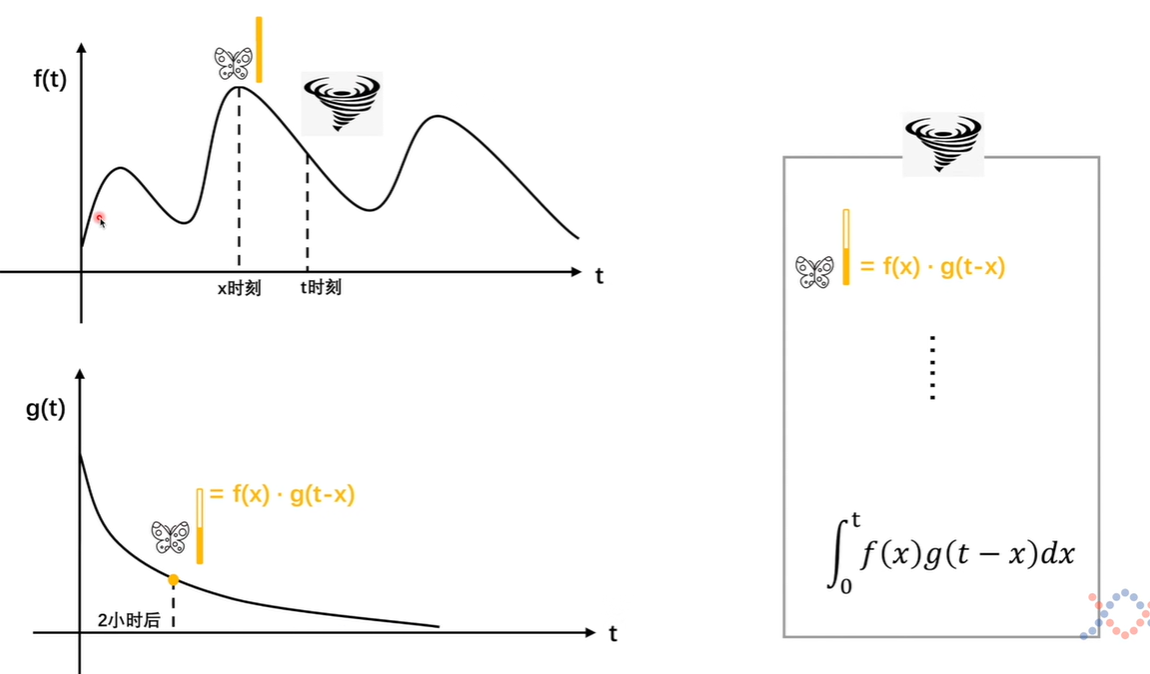 假设是在t时刻发生了飓风,而发生飓风的原因,是引因为在之前有很多蝴蝶扇动了翅膀,比如在x时刻一只蝴蝶扇动了翅膀,而这件事情会对t时刻发生的飓风产生影响,但是这个影响会随着时间的变化而改变,其影响的变化是由g函数来体现的。所以右侧方框里的卷积处理的是之前蝴蝶扇动翅膀,对现在发生的飓风产生了多少影响。所有可以重新理解卷积:在某一时刻发生了一件事,而这件事情的产生会受到之前很多事情的影响,具体怎么影响还要看之前事情发生的时刻x和此事件发生的的时刻t之间的时间。而规定这段时间事情影响力的变化的就是g函数