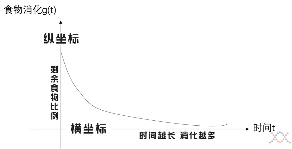 吃完东西总是要进行消化的,消化的速率和吃的什么以及吃了多少没有关系,只和时间有关,横坐标是时间,纵坐标是剩余食物的比例在某个时间还剩多少比例(并不是在胃里还有多少的食物)。