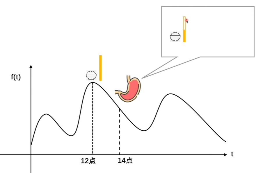 但现实问题是,吃掉的东西还是会被消化的,也就是说假设在中午12点吃了一碗米饭,当到下午两点的时候,米饭已经被消化了一部分,如果想直到被消化了有多少,只看f函数是不够的,还要参考消化函数