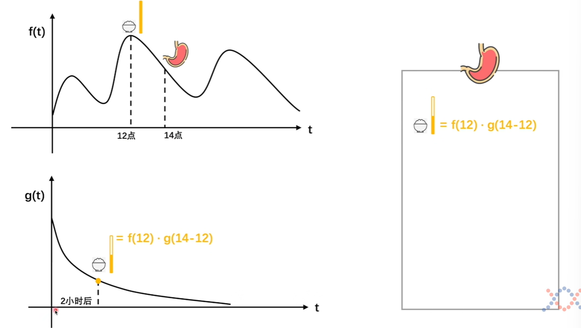 若要问某个时间胃里还有多少食物,就要用到卷积公式。在公式中: