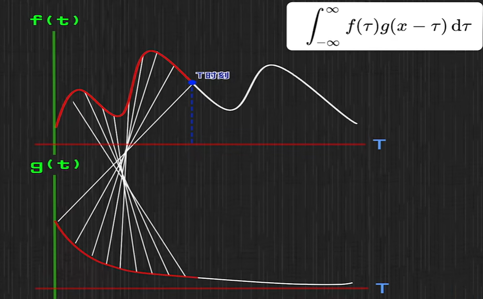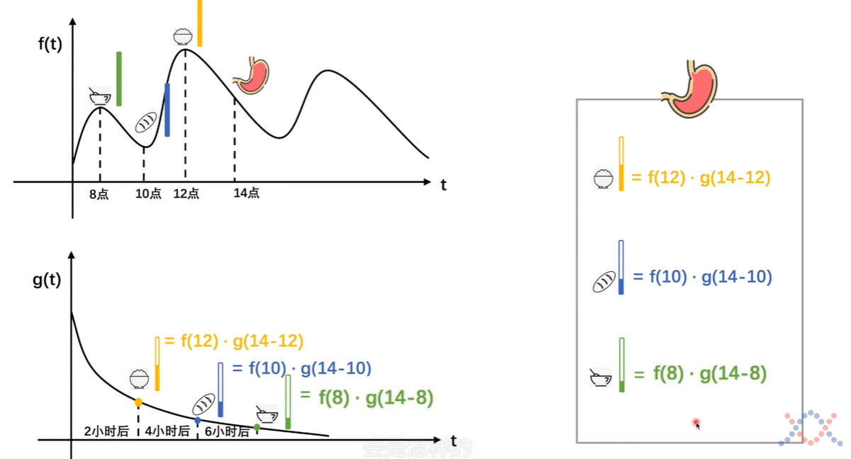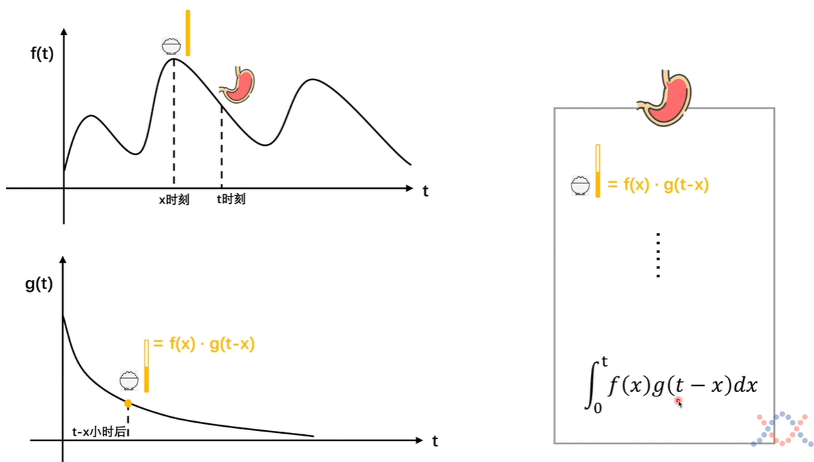 x和t-x可以代表着f函数和g函数的连线,可以是f函数上的点对应着的g函数上的点,这两个点相乘,得到的是t时刻还剩下多少x时刻吃下去的食物,将这些食物相加,也就是所有的f函数和g函数对应点的相乘再相加,得到的就是胃里剩下的所有食物。