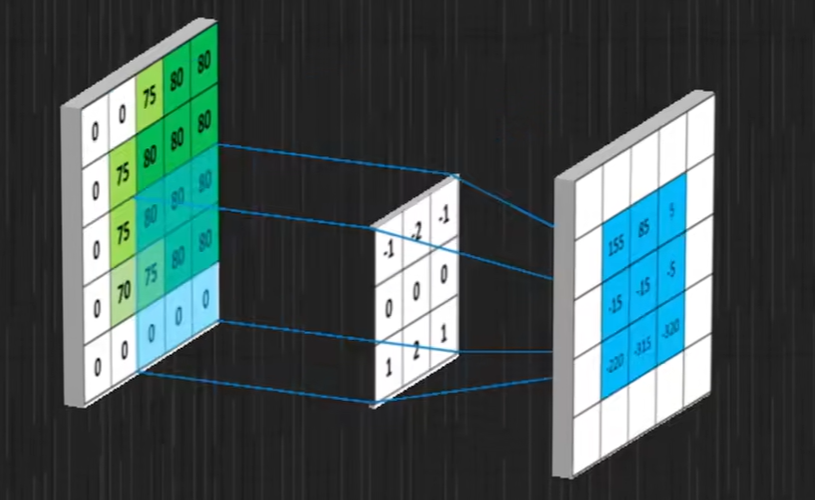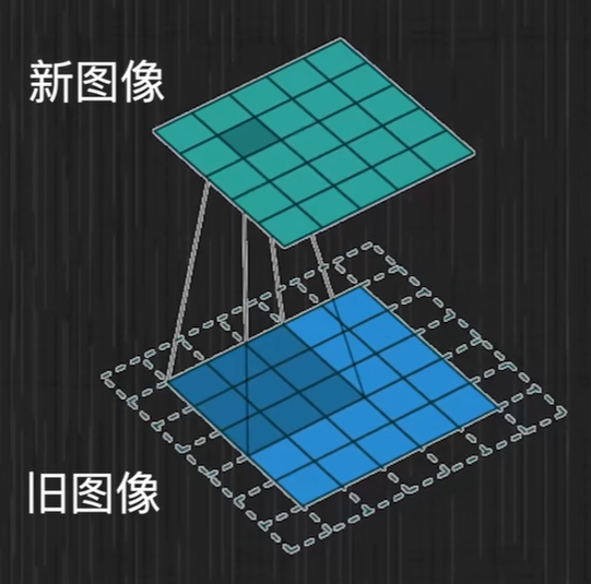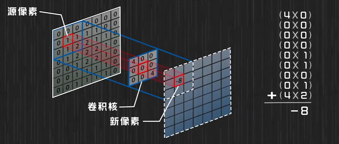 将卷积核扣在图像的点阵上,然后对应的两个数进行相乘,3*3的点阵,应该是有九个数进行相乘,最后还要把这9个结果相加保存到一起,这就相当于得到了一个新的像素值。