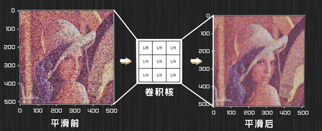 平滑卷积操作的效果也如图所示,什么是平滑操作?就是让周围的像素点和选定像素点相差不要太大。由此卷积核的作用便已知晓:就是规定了周围的像素点是如何对选定的当先像素点产生影响的
