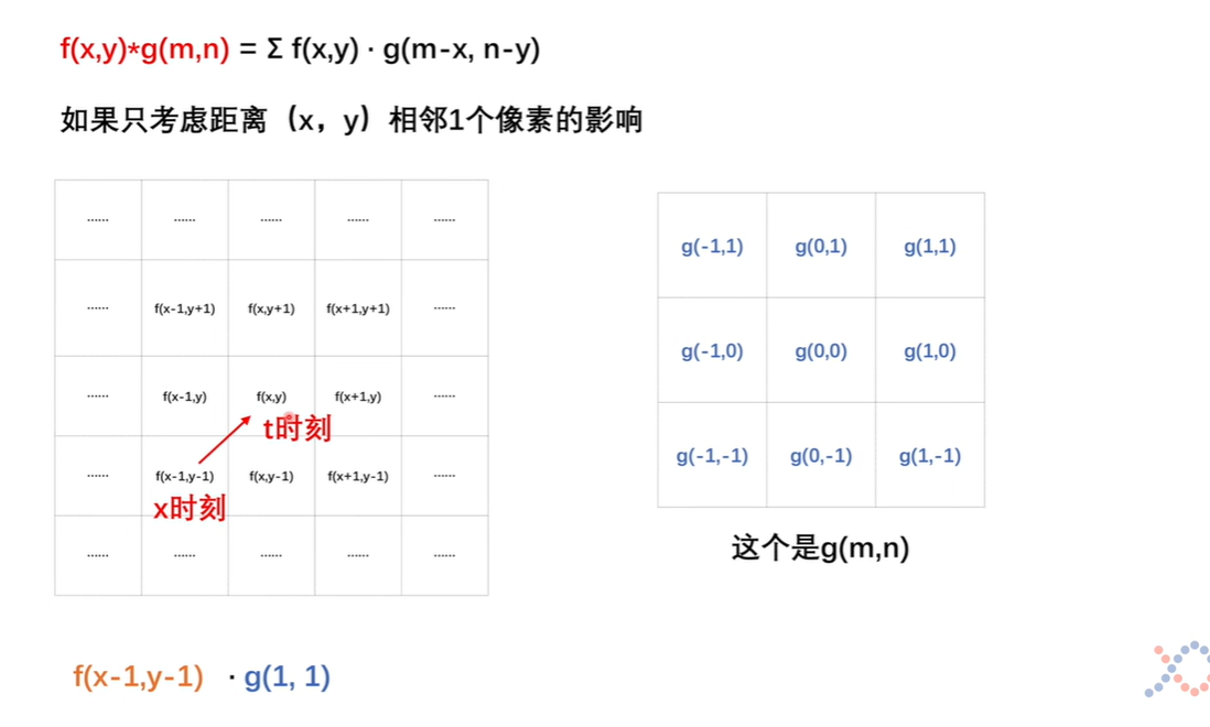 卷积核的数学运算 ,加入我们想知道左下角的像素点对中心像素点产生了什么样的影响,就可以类比成x时刻发生的事情对t时刻发生的事情产生的影响,就可以知道g函数的参数变量是t-x,就可以轻易的算出来左下角的像素点应该乘g(1,1)