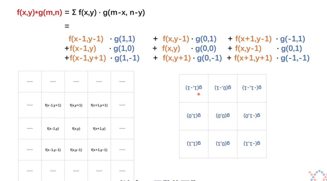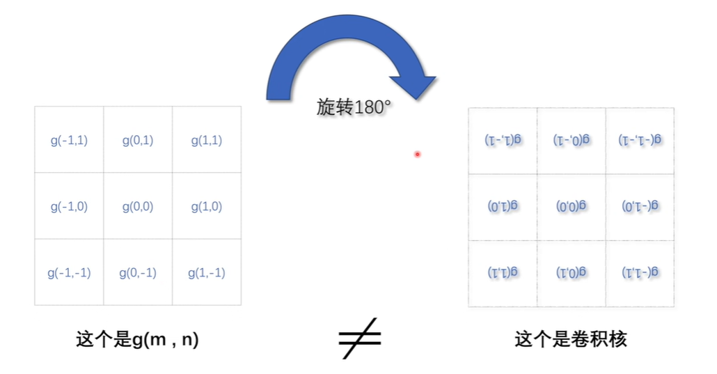 也就是说,g函数并不等于卷积核,二者刚好相差旋转的180°,我们前面看到的卷积核是可以直接扣在图像上,直接相乘再相加,已经省去了旋转的步骤